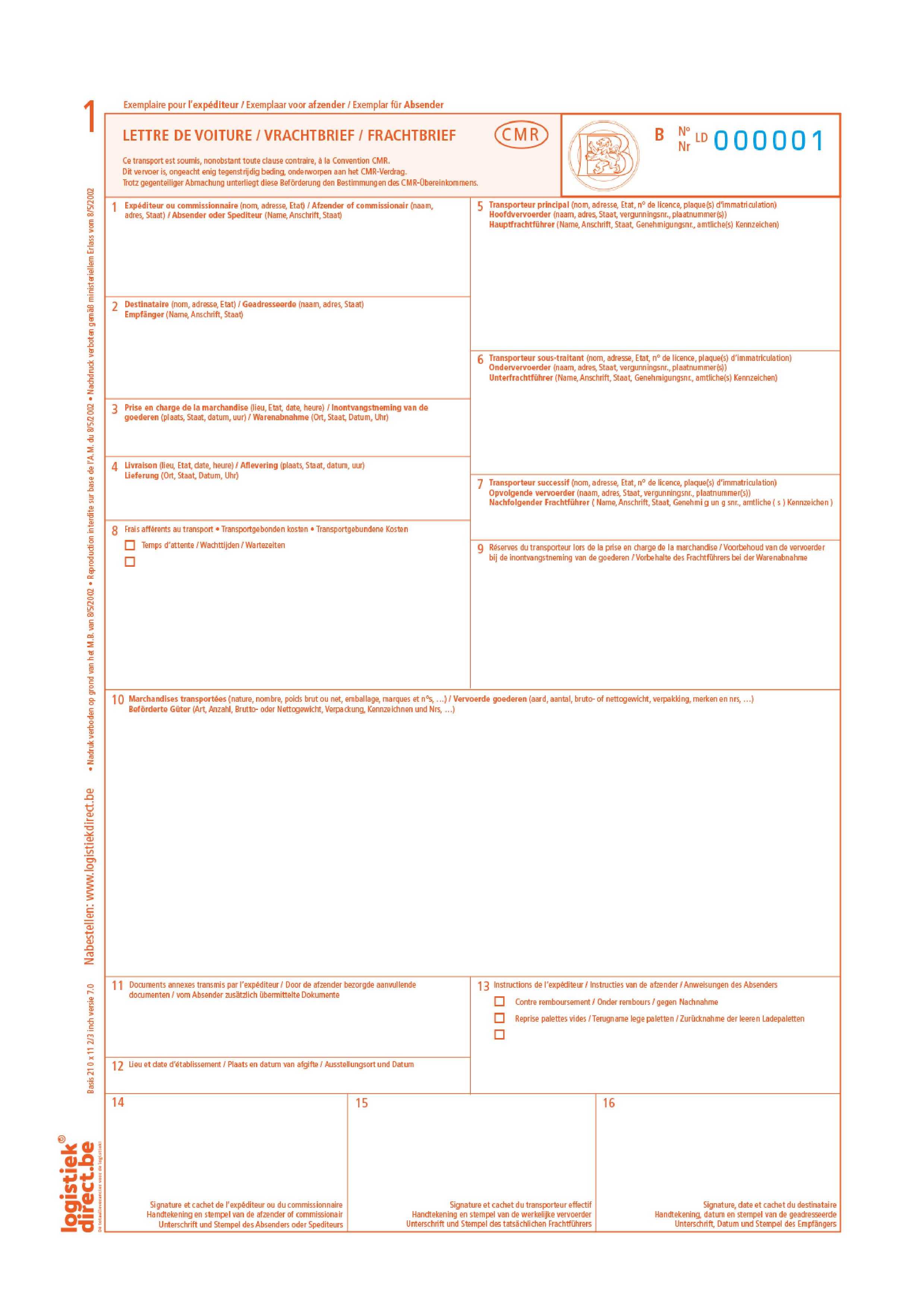 CMR vrachtbrieven voor de Belgische markt mogen enkel worden afgegeven door de beroepsorganisaties en door uitgevers die door de FOD Financiën erkend zijn. De Belgische staat heeft ons vergunning verleend als erkend drukker van CMR vrachtbrieven. De CMR's zijn voorzien van het rijkszegel.