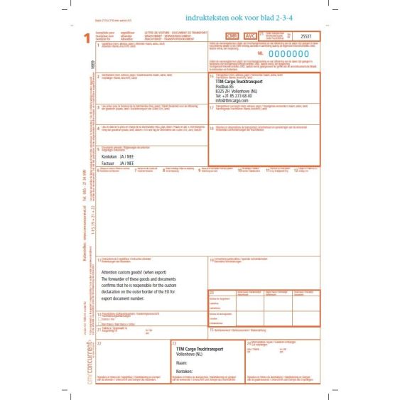 Voor elke beroepschauffeur onderweg, is de voorbedrukte CMR vrachtbrief de meest herkenbare vrachtbrief. Altijd bij de hand om de zending te voorzien van een handgeschreven CMR vrachtbrief. De vrachtbrief voorzien van uw eigen indruk, voorkomt veel schrijfwerk, u maakt bijvoorbeeld een standaard voorbehoud, de CMR kan worden voorzien van overzichtelijke schema's en uw eigen naam en logo is natuurlijk een extra pré op de vrachtbrief.