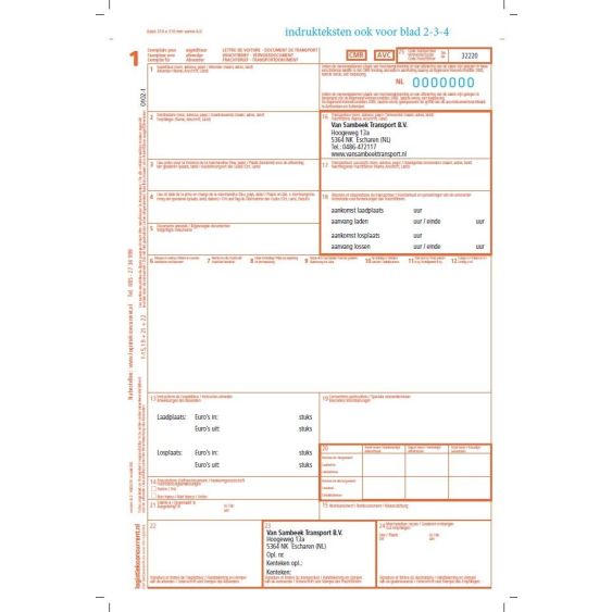 Voor elke beroepschauffeur onderweg, is de voorbedrukte CMR vrachtbrief de meest herkenbare vrachtbrief. Altijd bij de hand om de zending te voorzien van een handgeschreven CMR vrachtbrief. De vrachtbrief voorzien van uw eigen indruk, voorkomt veel schrijfwerk, u maakt bijvoorbeeld een standaard voorbehoud, de CMR kan worden voorzien van overzichtelijke schema's en uw eigen naam en logo is natuurlijk een extra pré op de vrachtbrief.