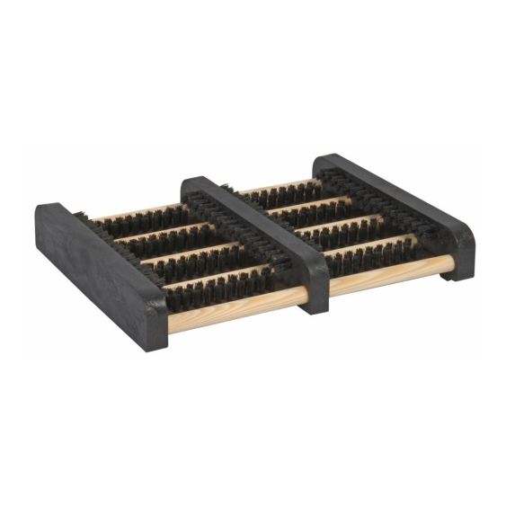 Ce balai à pieds convient au nettoyage des chaussures, etc. Le balai est en bois. Au milieu se trouvent des brosses en plastique dur pour nettoyer le côté et le dessous de vos chaussures. Des profils antidérapants en caoutchouc sont fixés sur le dessous du balai à pieds, afin qu'il ne glisse pas pendant l'utilisation.