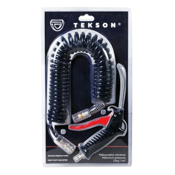 Luchtpistool van het merk Tekson voor het schoonhouden van de vrachtwagencabine. Met een luchtpistool blaas je stof en ander vuil weg uit alle hoeken en kieren van de cabine. Het zwarte luchtpistool met luchtspiraal heeft een maximale lengte van 5 meter, zodat deze makkelijk door de gehele cabine gebruikt kan worden. Het luchtpistool is erg duurzaam in gebruik en is voorzien van een stalen nozzle. Daarnaast heeft het luchtpistool een werkdruk van 13kg/cm2. Het luchtpistool heeft een Scania aansluiting en is daardoor te gebruiken in de vrachtwagencabines van Scania.
