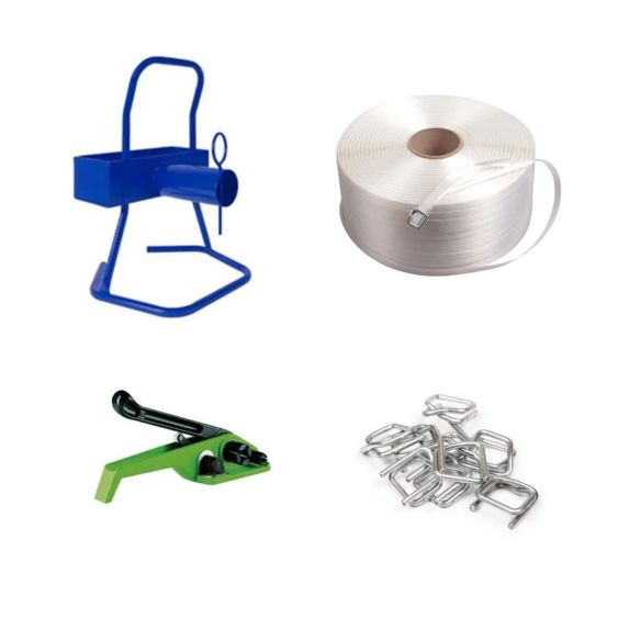 Deze complete polyester omsnoerings startersset is geschikt voor het omsnoeren van grote zware pakketten en pallets. De startersset bestaat uit twee rollen polyesterband met een breedte van 19 mm, een handspanner, een set gespen van 19 mm en een draagbare haspel.