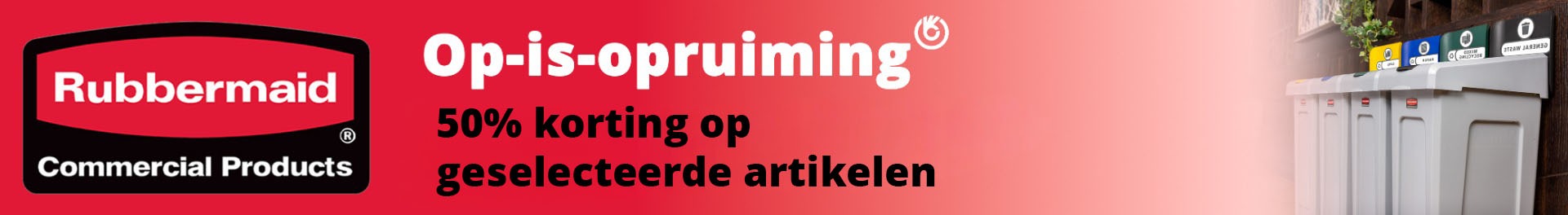 Profiteer nu van 50% korting op geselecteerde Rubbermaid producten! De hoogwaardige en degelijke afvalbakken en - accessoires van Rubbermaid zijn geschikt voor intensief gebruik en daardoor ideaal om jouw magazijn, kantoor of andere werkruimte netjes en overzichtelijk te houden.