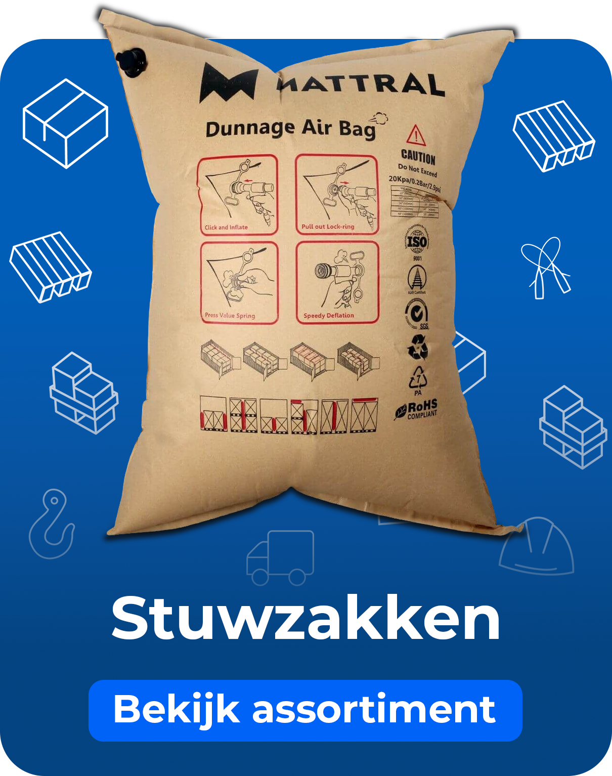Stuwzakken worden gebruikt om lege ruimtes tussen lading op te vullen. Door deze ruimtes op te vullen voorkom je dat goederen kunnen verschuiven tijdens transport. Stuwzakken zijn vooral effectief bij gedeeltelijk geladen voertuigen of bij transport van pallets en dozen. Ze zorgen voor een gelijkmatige drukverdeling en dragen bij aan een stabiel geheel, zonder dat de lading beschadigt.